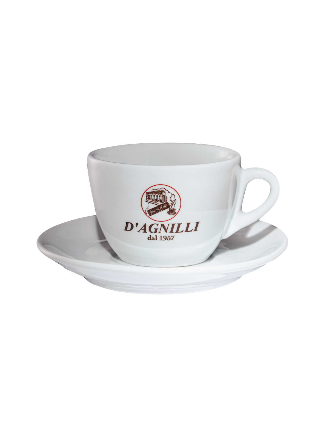 2 porcelain espresso cups with saucers made in Italy branded with the D’Agnilli logo.