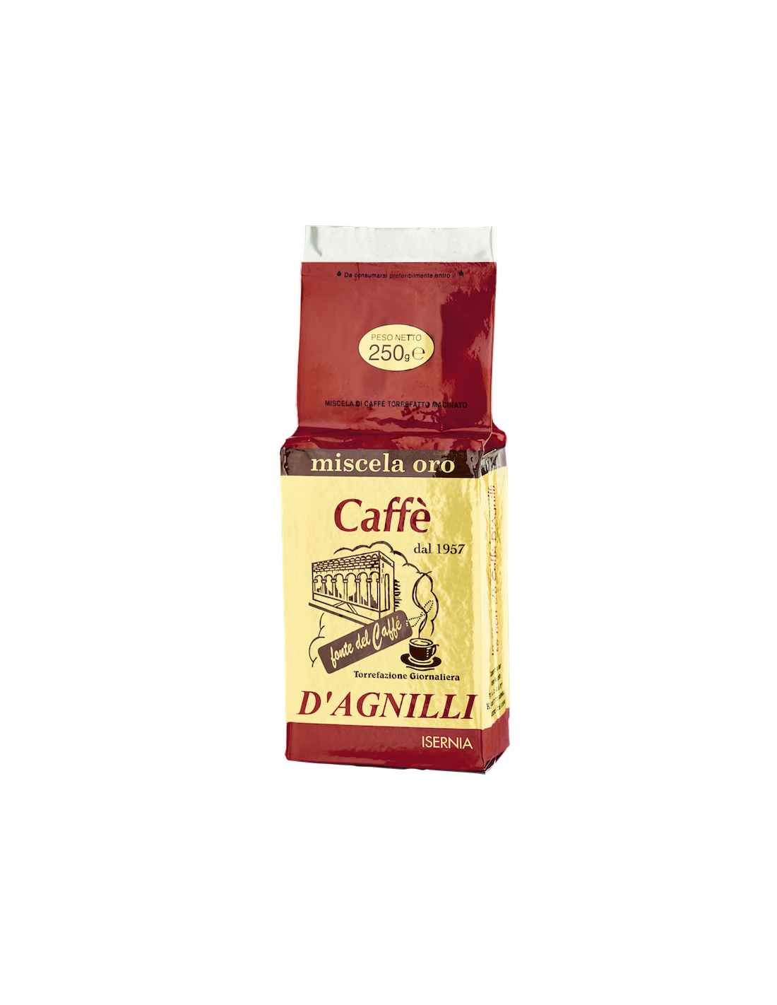 2 packages of coffee Miscela Oro 250 gr: This blend contains a high percentage of Robusta which gives the coffee a full-bodied flavor, a more persistent bitterness, and slight acidity. Miscela Oro is dedicated to those who love strong tastes and need a burst of energy to make it through the day. Ground coffee for Moka pot.